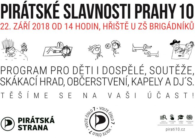Přijďte na Pirátské slavnosti Prahy 10 1 comments/ 10. 9. 2018 V sobotu 22. září 2018 je pro vás připraven bohatý program pro děti i dospělé. Od 14 hodin se na vás těšíme na travnatém hřišti u ZŠ Brigádníků (mapa). Budeme vás čekat za každého počasí! Under : Pirátské slavnosti, Umění