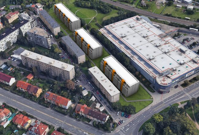 Domy mají vyrůst na zelených pozemcích mezi budovou supermarketu Tesco a nynější zástavbou v Michelangelově ulici. Podle žádosti o stavební povolení půjde o tři domy, z nichž dva budou propojeny společným podzemním podlažím.