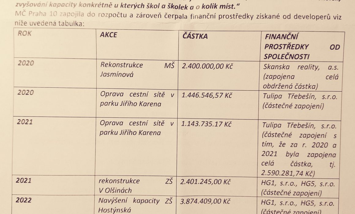 Oficiální vyjádření MČ Praha 10 na dotaz zastupitele a dle informačního zákona 106/1999 Sb. – součet částek dodatečně doplněn