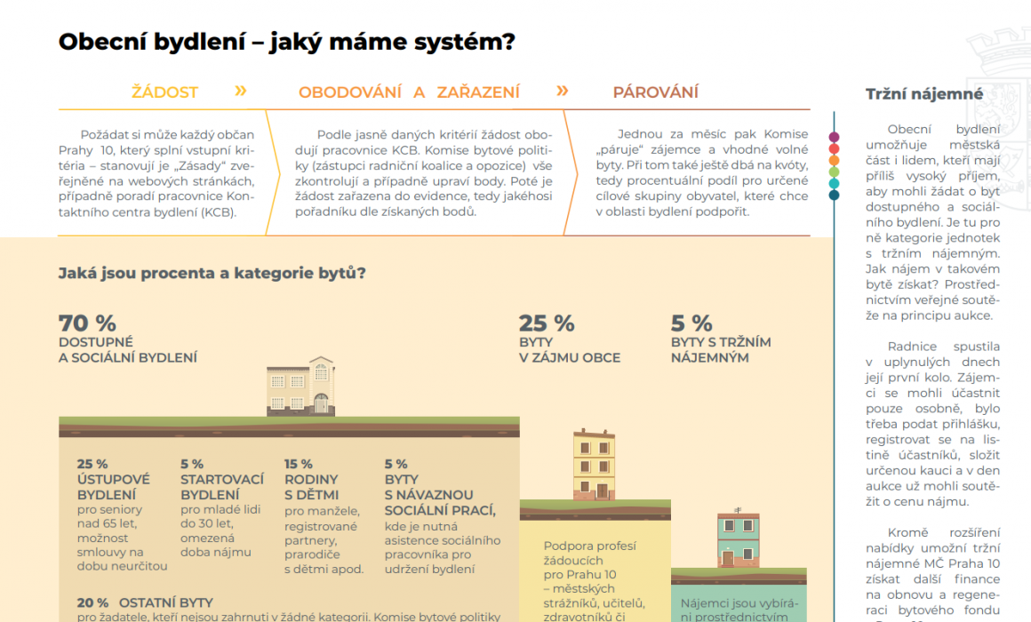 Městská část Praha 10 upravuje pravidla pro pronajímání svých bytů, otevírá dostupné a sociální bydlení většímu počtu svých občanů. Horní hranice příjmu, po odečtení normativních nákladů na bydlení, se u domácností posouvá na trojnásobek životního minima (namísto stávajícího 2,25 násobku). Bytové jednotky budou i nadále přidělovány na základě „bodovacího systému“, který zvýhodňuje lidi s komplexními problémy ve vážné bytové situaci. Revizi tzv. Zásad dnes schválilo Zastupitelstvo Desítky.